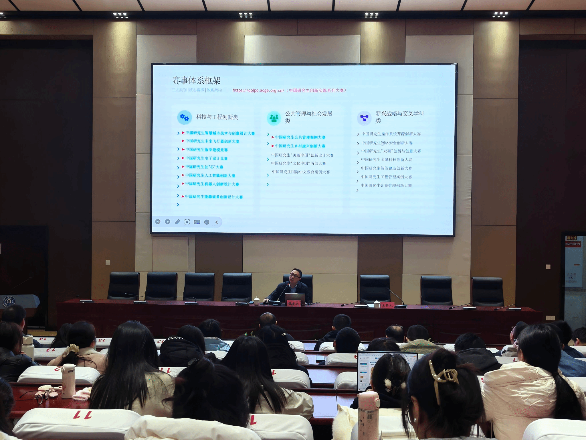 2025年11月18日下午,学校在行知楼B104举办“研究生创新创业赛事解读与实战赋能”专题讲座。讲座由党委研究生工作部副部长、研究生处副处长刘磊主持。各研究生招生单位分管副院长、研究生导师、骨干教师代表及全体2025级硕士研究生参会。